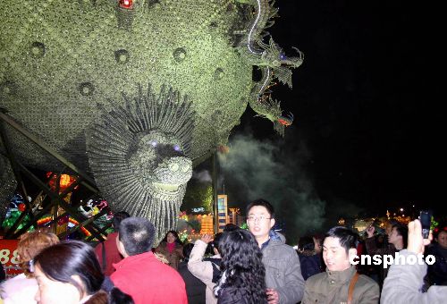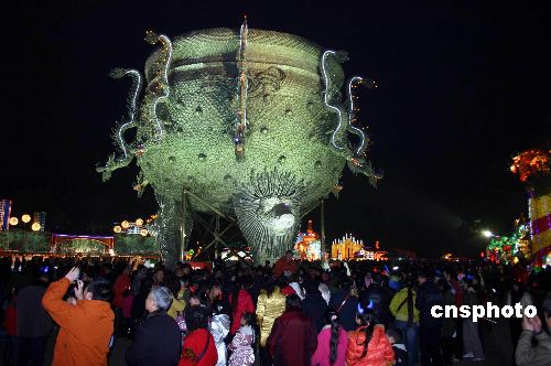 圖為逾30萬只景德鎮(zhèn)瓷器綁扎而成的巨大“九龍鼎”,重近百噸,游客嘆為觀止。中新社發(fā) 黃永莉 攝