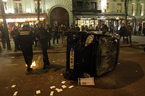 中新網(wǎng)1月30日電 法國全國有逾百萬人在29日罷工,抗議總統(tǒng)薩科齊處理金融危機(jī)的手法未能令工人受惠。在巴黎,示威演變成騷亂,示威者在商業(yè)大街?jǐn)S玻璃樽和放火,更與警方爆發(fā)推撞,警方施放催淚氣體驅(qū)散群眾。