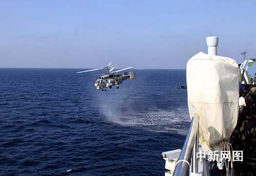 中新網(wǎng)“?凇迸瀬喍1月31日電 當(dāng)?shù)貢r(shí)間1月29日上午,中國海軍護(hù)航編隊(duì)“?凇碧(hào)導(dǎo)彈驅(qū)逐艦數(shù)名特戰(zhàn)隊(duì)員由艦載直升機(jī)滑降到被護(hù)香港“鵬程”號(hào)商船上,執(zhí)行“?凇迸灥谝淮螌(shí)施的隨船護(hù)衛(wèi)行動(dòng)。圖為直升機(jī)從“海口”艦起飛奔赴被護(hù)香港商船。