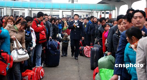 1月30日,江西樂(lè)平市火車(chē)站迎來(lái)了以外出務(wù)工的農(nóng)民工為主的客流高峰。中新社發(fā) 朱定文 攝