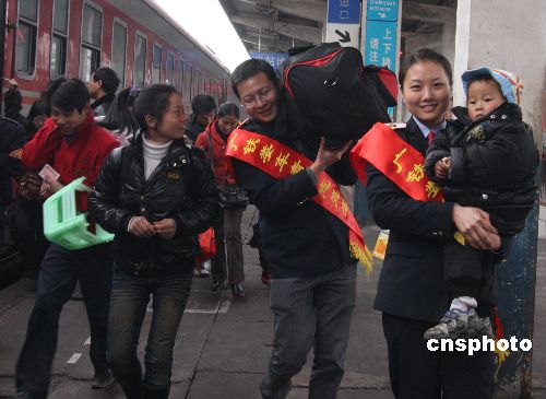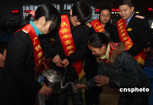 2月3日,湖南婁底車務(wù)段青年志愿者在婁底火車站為旅客提供各種幫助。當(dāng)日,婁底火車站迎來(lái)節(jié)后返程客流高峰,婁底車務(wù)段團(tuán)委近千名團(tuán)員青年志愿者開展了“和諧春運(yùn) 婁車青年志愿者與你同行”活動(dòng)。在管區(qū)內(nèi),青年志愿者為旅客提供溫馨服務(wù),盡心為老弱病殘等旅客排憂解難。中新社發(fā) 郭國(guó)權(quán) 攝