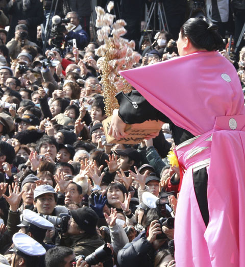 2月3日,在日本靜岡縣熱海市舉行了“撒豆子”儀式,炒熟的黃豆在日本被稱為“福豆”,儀式主辦方請(qǐng)來名人站在高處,將炒熟的黃豆拋向人群,以驅(qū)邪迎福,祈愿身體健康。