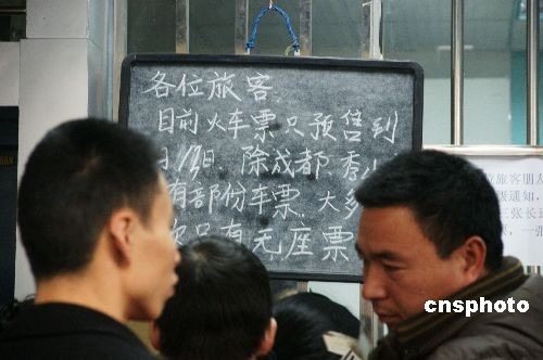 2009年2月4日,旅客在重慶市一火車票代售點(diǎn)排隊買票。當(dāng)日,重慶迎來節(jié)后客流最高峰,車票已預(yù)售至13日,除發(fā)往成都、秀山方面的火車還有部分余票外,其他車次均為無座票。中新社發(fā) 姜純 攝
