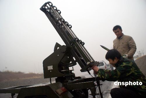 2月7日,河南濟源市為緩解旱情,密切關注天氣變化,抓住有利時機,當天下午在4個地點同時使用火箭和高炮進行人工增雨作業(yè)。