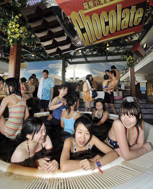 2月8日,游客們在日本神奈川縣享受奇特的“巧克力浴”,以此慶祝即將到來的情人節(jié)。