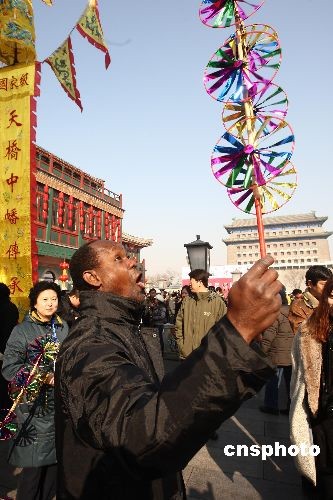 元宵節(jié)來(lái)臨,北京前門(mén)大街舉行民間花會(huì)踩街活動(dòng),一名外國(guó)觀眾手舉風(fēng)車(chē)玩得很過(guò)癮。踩街是一種中國(guó)傳統(tǒng)民間民俗藝術(shù)表演形式,類(lèi)似國(guó)外的花車(chē)游行,表演隊(duì)伍邊行進(jìn)邊表演,百姓沿途觀看。中新社發(fā) 杜洋 攝