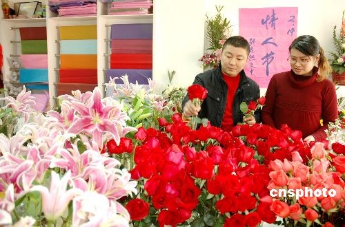 2月11日,隨著“情人節(jié)”來臨,安徽省巢湖市各商家搶占節(jié)日商機(jī)。琳瑯滿目的鮮花、巧克力、情侶飾品成為情人節(jié)的熱銷品,整個巢城一片濃濃的洋節(jié)氣氛。中新社發(fā) 驕陽 攝