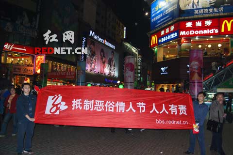 “快來(lái)看,抵制惡俗情人節(jié),人人有責(zé)!這活動(dòng)真好,你還過(guò)什么情人節(jié)啊?!”12日晚上7點(diǎn)半,在長(zhǎng)沙黃興南路步行街上,兩名男子拉起了一個(gè)約四米長(zhǎng)一米寬的抵制情人節(jié)的橫幅,引起了許多路人的興趣,還有不少人上前簽名表示支持這種活動(dòng),橫幅上簽有許多秘密麻麻的支持該活動(dòng)的留言,當(dāng)然,還吸引來(lái)了長(zhǎng)沙各大媒體來(lái)采訪,也有人認(rèn)為這有作秀的嫌疑,可謂眾說(shuō)紛紜。