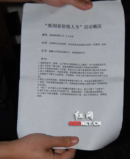 其中,組織者“小溪里的石頭”還給記者看了一份他們的組織概況,其目的就是要提醒人們關(guān)注民族節(jié)日,拒絕惡俗洋節(jié),并列舉了十大理由:我國的春節(jié)、清明、七夕等節(jié)日需要我們大力推崇。情人節(jié)其實是“情人劫”,看看西餐館忙碌的廚子和商家招牌就知道了。你忍心讓小孩子抱著你的大腿求你買花嗎?情人節(jié)腐蝕青年一代的價值觀,銅臭味道很濃,現(xiàn)在正是經(jīng)濟(jì)危機(jī),奢侈消費不妥當(dāng)!扒槿恕痹谥袊诵哪恐械母拍钤缇妥兞宋秲海槿斯(jié)成了“出軌節(jié)”等等。