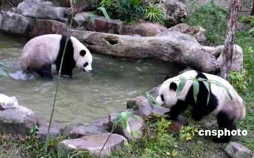 圖為“團(tuán)團(tuán)”“圓圓”在戶外展場(chǎng)的水池內(nèi)戲水玩耍。中新社發(fā) 路梅 攝