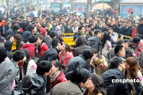 2月14日,杭州市首屆情人節(jié)“牛吻”大賽在武林銀泰、西湖銀泰、杭州百貨大樓三地同時(shí)舉行,活動(dòng)吸引了80對(duì)情侶前來(lái)參加。中新社發(fā) 引煒 攝