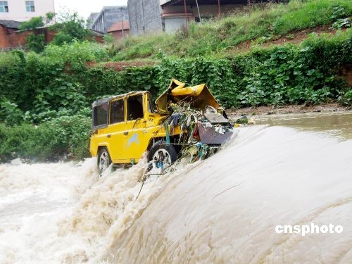 08年6月11日,一輛載人吉普車在通過浙江浦江縣七里村一座小橋時為避讓對面行人,不幸連車帶人墜入水中。吉普車隨著水流輾轉(zhuǎn)“漂流”1000多米,最終擱淺在溪中下游一座攔水壩處。一位青年正好路過,看到有車子落水,他急忙趕了過去,當他看到司機托起坐在副駕駛室里一名女子時,立即將該女子拉了上來。一會,司機也從車里鉆了出來,因水勢兇猛,吉普車一路翻轉(zhuǎn),順著溪流沖向下游,他們只能眼睜睜地看著吉普車隨水飄走。中新社發(fā) 許康平 攝