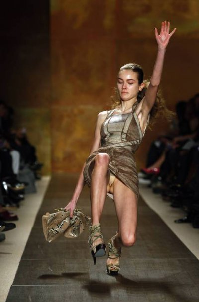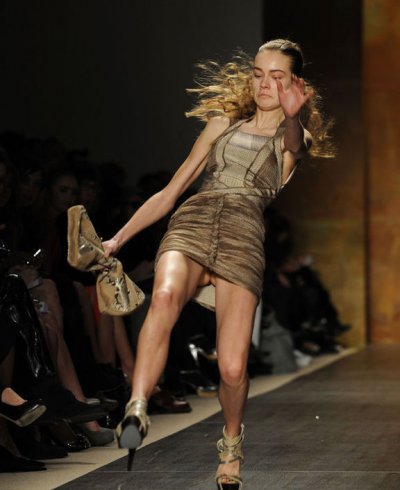 2月13日-15日,在紐約時尚周上,不斷有模特走秀時出現(xiàn)尷尬鏡頭,或者把鞋走丟,或者失足走光。