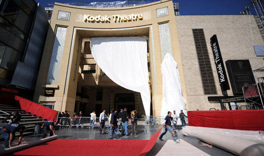 2月18日,在美國好萊塢柯達劇院,工人們正在門前鋪設紅地毯,準備迎接奧斯卡的頒獎典禮。第81屆奧斯卡獎頒獎典禮將于22日在柯達劇院舉行,將會有眾多明星走過這條“星光大道”。
