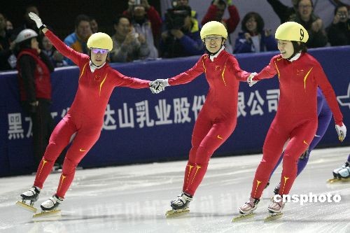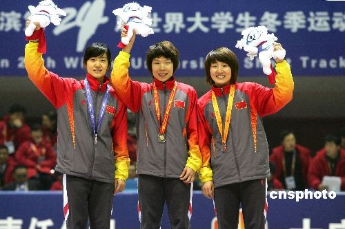 2月19日,世界大冬會短道速滑女子1500米決賽結(jié)束,中國隊(duì)包攬前三名,周洋以2分31秒658奪得金牌,這也是中國代表團(tuán)在本次大冬會奪得的首枚金牌,劉秋宏和孫琳琳分列2、3位。中新社發(fā) 富田 攝