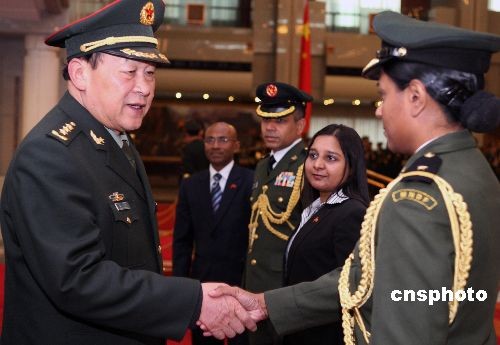 國(guó)務(wù)委員兼國(guó)防部長(zhǎng)梁光烈上將,2月19日下午在北京八一大樓會(huì)見(jiàn)來(lái)訪的馬爾代夫國(guó)防與國(guó)家安全部長(zhǎng)費(fèi)薩爾及其陪同人員。中新社發(fā) 宋吉河 攝