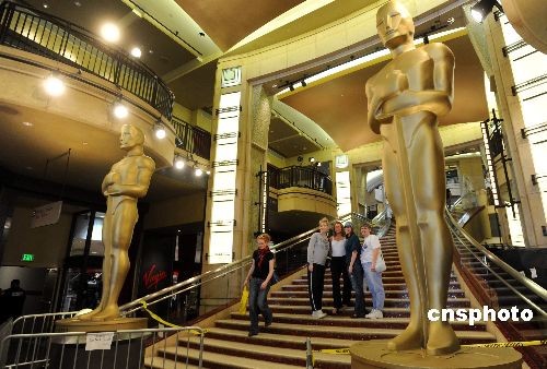 當(dāng)?shù)貢r(shí)間二月二十日,游客在好萊塢柯達(dá)劇場入口處的奧斯卡金像模型前留影。全球影迷矚目的第八十一屆奧斯卡電影金像獎(jiǎng)?lì)C獎(jiǎng)典禮將于二十二日晚在這里舉行,通往劇場的巨大紅地毯已經(jīng)鋪就,各項(xiàng)準(zhǔn)備工作基本就緒。印度題材的電影《貧民富翁》被認(rèn)為是今年最佳影片獎(jiǎng)的最大熱門。中新社發(fā) 張煒 攝