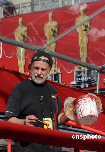 當?shù)貢r間二月二十日,工作人員正在好萊塢柯達劇場外粉刷明星抵達看臺。全球影迷矚目的第八十一屆奧斯卡電影金像獎頒獎典禮將于二十二日晚在柯達劇場舉行,通往劇場的巨大紅地毯已經(jīng)鋪就,明星抵達看臺搭建完畢,各項準備工作基本就緒。中新社發(fā) 張煒 攝