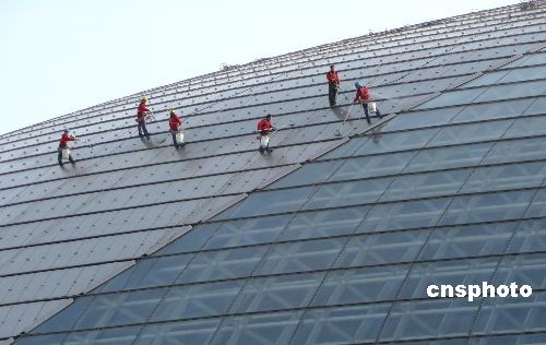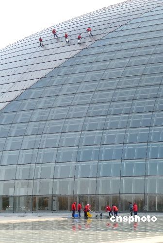 2009年2月22日,保潔人員正在認(rèn)真清洗北京國(guó)家大劇院外壁及景觀池玻璃上的塵土,使其以靚麗清潔的容貌迎接全國(guó)兩會(huì)的召開(kāi)。