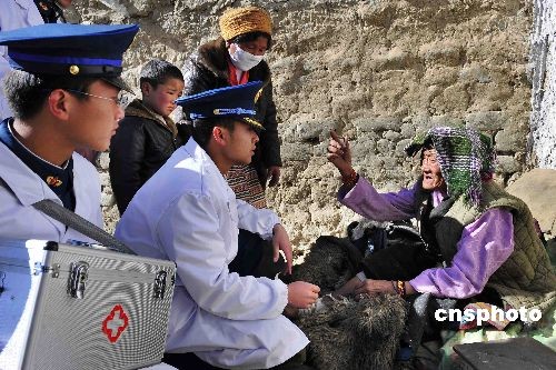 圖為醫(yī)療小分隊成員深入藏族同胞家中,為行動不便的病人診治。中新社發(fā) 郭超英 攝