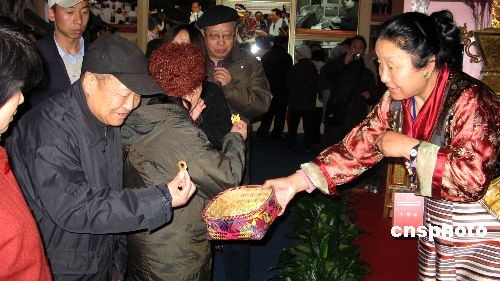 2月25日,在北京民族文化宮舉辦的《西藏民主改革50年大型展覽》免費(fèi)向民眾開放,來自西藏的藏族同胞現(xiàn)場(chǎng)向觀眾發(fā)放藏族小麻花等禮品。中新社發(fā) 鄒憲 攝