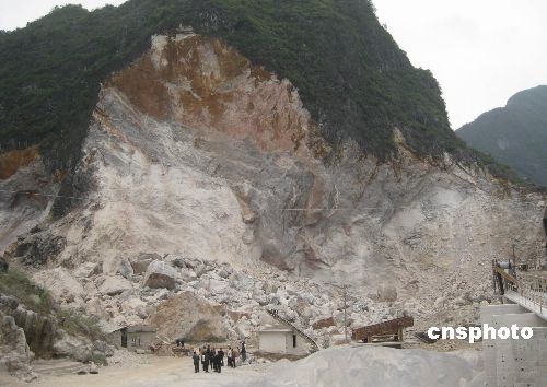 二月二十六日晚,廣西河池市都安縣一采石場山體大面積塌方,滾落的巨石摧毀山下一間房屋及三輛大卡車,造成一人死亡一人受傷。