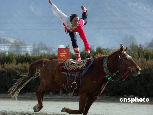 2月27日,拉薩賽馬場(chǎng)上演一年一度的傳統(tǒng)賽馬表演,西藏馬術(shù)隊(duì)的女騎手精湛的技藝博得了場(chǎng)內(nèi)觀(guān)眾的陣陣喝彩。中新社發(fā) 劉震 攝