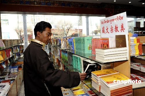 2009年初春,西藏拉薩一書(shū)店內(nèi),藏族民眾在選購(gòu)藏文書(shū)籍。西藏自治區(qū)已經(jīng)累計(jì)出版各類(lèi)藏漢文圖書(shū)11300種、1.5億多冊(cè)。中新社發(fā) 廖攀 攝