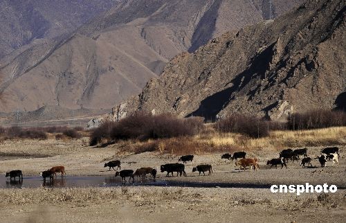 2009年初春,從拉貢公路上望去,成群的牦牛正在趟過拉薩河。由于生態(tài)環(huán)境的改善,西藏的野牦牛數(shù)量增多了,一些地方經(jīng)常發(fā)生野生公牦牛趁夜色,摸進村子拐跑家養(yǎng)母牦牛的事情。中新社發(fā) 廖攀 攝
