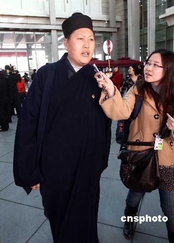 3月1日,赴北京參加“兩會”的全國政協(xié)委員、四川省道教協(xié)會會長、青城山天師洞道觀道長唐誠,剛一抵達(dá)北京機(jī)場就被記者追訪。2OO9年全國“兩會”即將開幕,代表、委員們已開始陸續(xù)抵京報(bào)到。中新社發(fā) 杜洋 攝