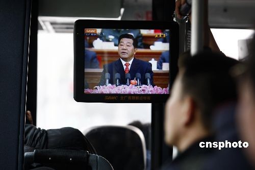 3月3日,全國政協(xié)十一屆二次會議在北京人民大會堂開幕,北京市民在公交車上通過移動電視收看相關(guān)報道。中新社發(fā) 鄭雄增 攝