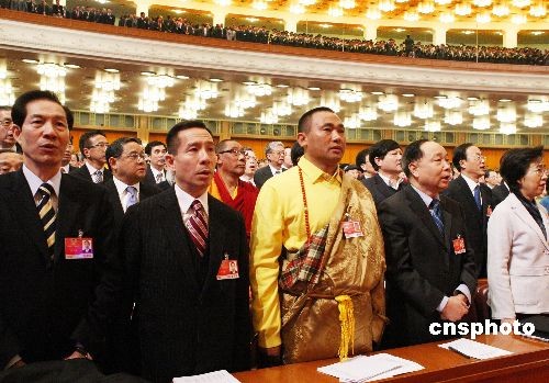 全國政協十一屆二次會議3月3日下午在人民大會堂隆重開幕,與會委員在開幕大會上高唱國歌。今年全國“兩會”在議程安排方面做出重大調整,在開幕式和閉幕式上,將原來的“奏國歌”改為“唱國歌”。這一改變采納了代表和委員的議案和提案。中新社發(fā) 宋吉河 攝