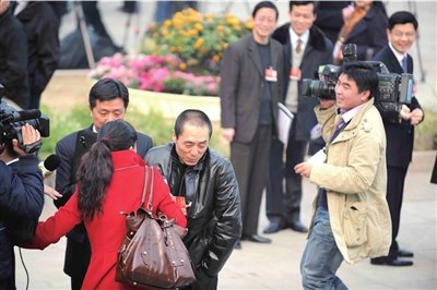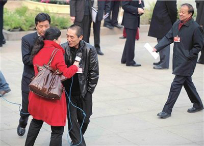 一個電視臺的女記者攔住張藝謀委員,央求給點(diǎn)兒“下鍋菜”,否則回去沒法交差。范繼文 攝