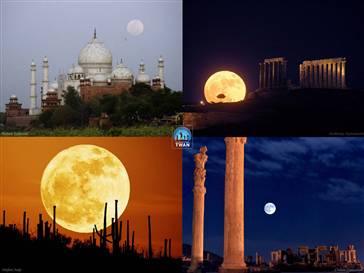 本圖顯示的是夜晚升起于世界四大著名景點(diǎn)上空的滿月。從左上圖起按順時(shí)針方向看,四幅子圖分別是:印度阿格拉市郊的泰姬陵、希臘蘇尼翁海岬的海王波塞冬神殿、伊朗設(shè)拉子市的波斯波利斯古城遺址以及亞利桑那州的仙人掌國家公園。泰姬陵是印度知名度最高的古跡之一,位于距印度新德里約200多公里外的阿格拉城內(nèi),是莫臥兒王朝第5代皇帝沙賈汗為了紀(jì)念已故皇后而修建的陵墓,被譽(yù)為“完美建筑”。仙人掌國家公園位于美國亞利桑那州南部,靠近墨西哥邊境。景區(qū)總面積約369平方公里,主要分為兩部分,一部分位于東郊,另外一部分位于西郊。這是一個(gè)以欣賞仙人掌和沙漠風(fēng)光為特色的國家公園。