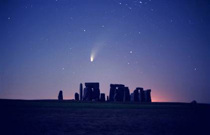本圖是1997年海爾-波普彗星飛越巨石陣上空時被攝影師拍下來的照片。西蒙斯認為,這幅圖也許可以將人類的現(xiàn)在與過去和將來聯(lián)系到一起。該彗星上次出現(xiàn)于巨石陣上空大約是4000千年前。當(dāng)它再一次回來時,預(yù)計是在2000年后。英國巨石陣大約建于公元前3100年。關(guān)于巨石陣的用途,至今頗具爭議。有人認為這是一種典型的古代葬禮或祭祀遺址,同時也有人認為它還是一種天文觀測站。一圈高大的石塊與一些豎立的巨石形成了一個半開口形狀的陣列。開口方向恰好指向夏至日太陽升起的方向。矗立在英國南部索爾茲伯里平原上的巨石陣,是英國最重要、最神秘的歷史遺跡之一。多數(shù)考古學(xué)家認為,它既是天文觀測站,也是古代宗教遺跡。