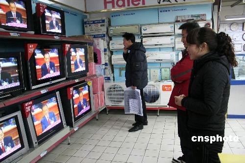 2009年3月5日上午,江蘇省大豐市一家超市家電部,顧客在收看溫家寶總理作政府工作報(bào)告。中新社發(fā) 周古凱 攝