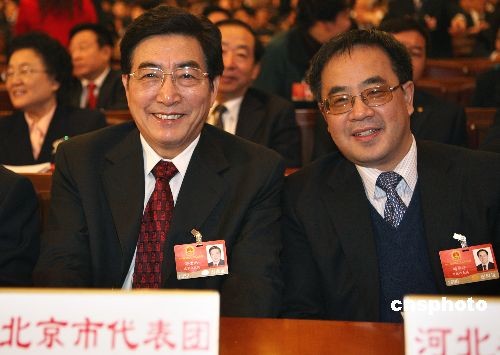3月5日上午,十一屆全國人大二次會(huì)議在北京人民大會(huì)堂開幕,先后在西藏工作過的的北京市市長郭金龍(左)、河北省省長胡春華出席大會(huì)時(shí)比鄰而坐。中新社發(fā) 任晨鳴 攝