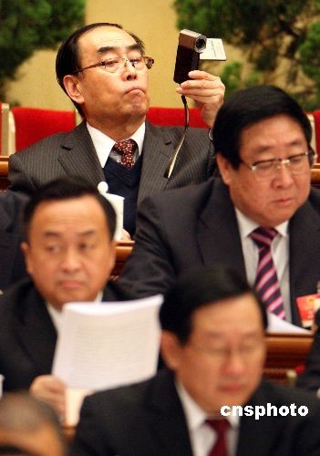 3月5日上午,十一屆全國人大二次會議在北京人民大會堂開幕,一名在主席臺最高層就座的主席團成員 “居高臨下”拍攝會議盛況。中新社發(fā) 任晨鳴 攝