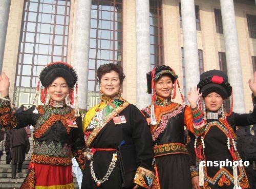 5日上午9時,十一屆全國人大二次會議在北京開幕。圖為身著民族服裝出席大會的四川女代表。中新社發(fā) 肖青 攝