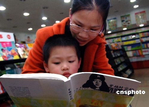 三月五日是中國(guó)“學(xué)雷鋒日”,福州一年輕母親在圖書城為兒子翻閱少兒版《穿越時(shí)空的雷鋒》一書。中新社發(fā) 劉可耕 攝
