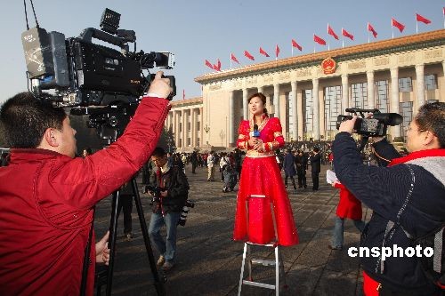 3月5日,十一屆全國人大二次會議在北京人民大會堂隆重舉行。大會吸引了近4000名中外記者前來采訪報道。圖為內(nèi)蒙古電視臺的記者在大會堂外做現(xiàn)場報道。中新社發(fā) 李松 攝
