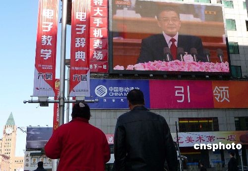 3月5日上午,十一屆全國人大二次會議在北京人民大會堂隆重開幕。王府井大街上的電視熒屏播放的溫總理作《政府工作報告》的直播吸引了市民的目光。中新社發(fā) 玉龍 攝