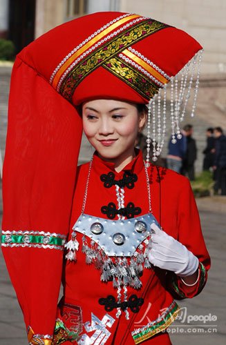 3月5日上午,是十一屆全國(guó)人大二次會(huì)議在人民大會(huì)堂內(nèi)開(kāi)幕的時(shí)間,會(huì)場(chǎng)內(nèi)代表委員們?yōu)闇乜偫砭实恼ぷ鲌?bào)告鼓掌喝彩,會(huì)場(chǎng)外人民大會(huì)堂東側(cè)門口的廣場(chǎng)上也因這些姑娘們的出現(xiàn)而光彩靚麗。她們是此次大會(huì)的壯族禮儀姑娘們,她們有著與60年共和國(guó)的旗幟一樣的色彩——中國(guó)紅!