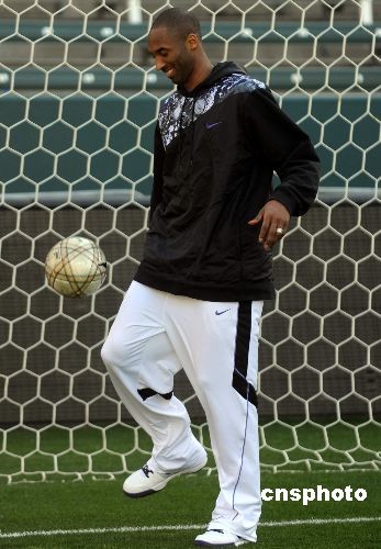 圖為少年時(shí)代曾練過足球的科比在綠茵場上秀球技。中新社發(fā) 張煒 攝