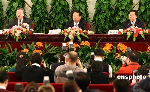 3月6日,十一屆全國人大二次會議在北京人民大會堂舉行記者會,國家發(fā)展和改革委員會主任張平、財(cái)政部部長謝旭人、中國人民銀行行長周小川就應(yīng)對國際金融危機(jī)、保持經(jīng)濟(jì)平穩(wěn)較快發(fā)展問題答記者問。中新社發(fā) 杜洋 攝