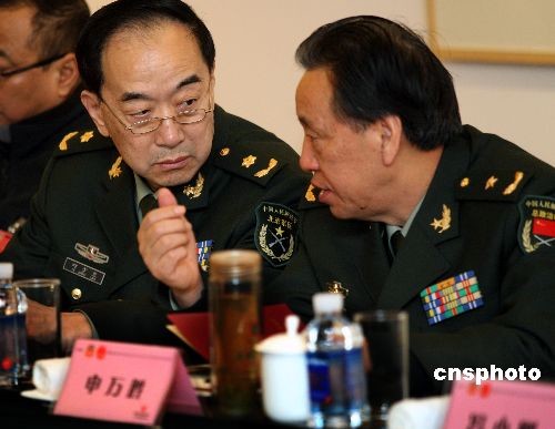 全國政協(xié)委員葉少蘭少將(左),3月6日在全國政協(xié)文藝界小組討論會上與申萬勝少將交談。中新社發(fā) 宋吉河 攝