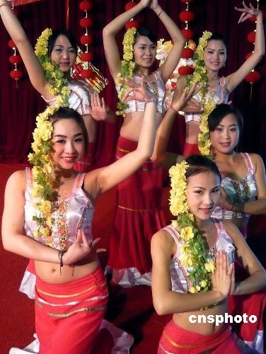 3月7日,為慶!叭.八”國(guó)際婦女節(jié)的到來(lái),北京植物園舉行賞花送花活動(dòng)。特設(shè)的“女人花”展區(qū)內(nèi)展示的花卉名稱(chēng)中均帶有“女”字:如“小葉女貞”、“舞女蘭”、“美女櫻”等。每位在熱帶展覽溫室參觀的女士,可以得到一束美麗的康乃馨。圖為云南傣族姑娘頭戴鮮花為參加活動(dòng)的游客表演舞蹈。中新社發(fā) 錢(qián)興強(qiáng) 攝