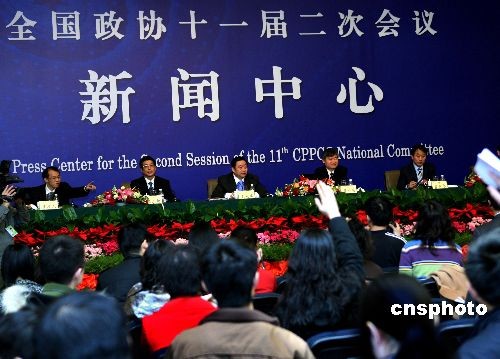 3月7日上午,全國政協(xié)十一屆二次會議就“大學(xué)生就業(yè)問題”舉行記者會,全國政協(xié)委員王超斌、張亞忠、蔡繼明、宗立成、金正新回答記者提問。他們普遍認(rèn)為,在國家出臺具體的政策扶持大學(xué)就業(yè)的同時(shí),大學(xué)生自身改變就業(yè)觀念也很重要,從正面看“大學(xué)生賣豬肉”現(xiàn)象具有積極意義。中新社發(fā) 宋吉河 攝
