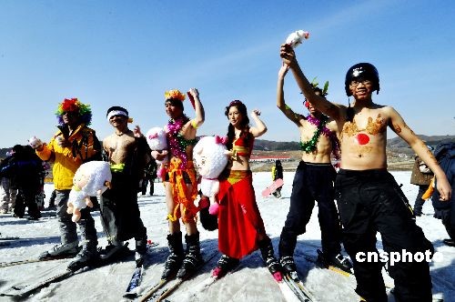 3月7日,沈陽市白清寨滑雪場舉行天體滑雪節(jié),活動分為特色服裝、創(chuàng)意滑雪等項目,全市20位市民報名參加,挑戰(zhàn)嚴(yán)寒。中新社發(fā) 文契 攝