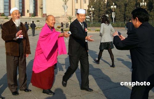 3月8日,全國(guó)政協(xié)十一屆二次會(huì)議在北京人民大會(huì)堂舉行第三次全體會(huì)議,參加會(huì)議的少數(shù)民族和宗教界政協(xié)委員互相拍照留念。中新社發(fā) 盛佳鵬 攝